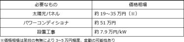 太陽光パネルとパワーコンディショナの価格相場と、工事にかかる費用相場は以下のとおりです。